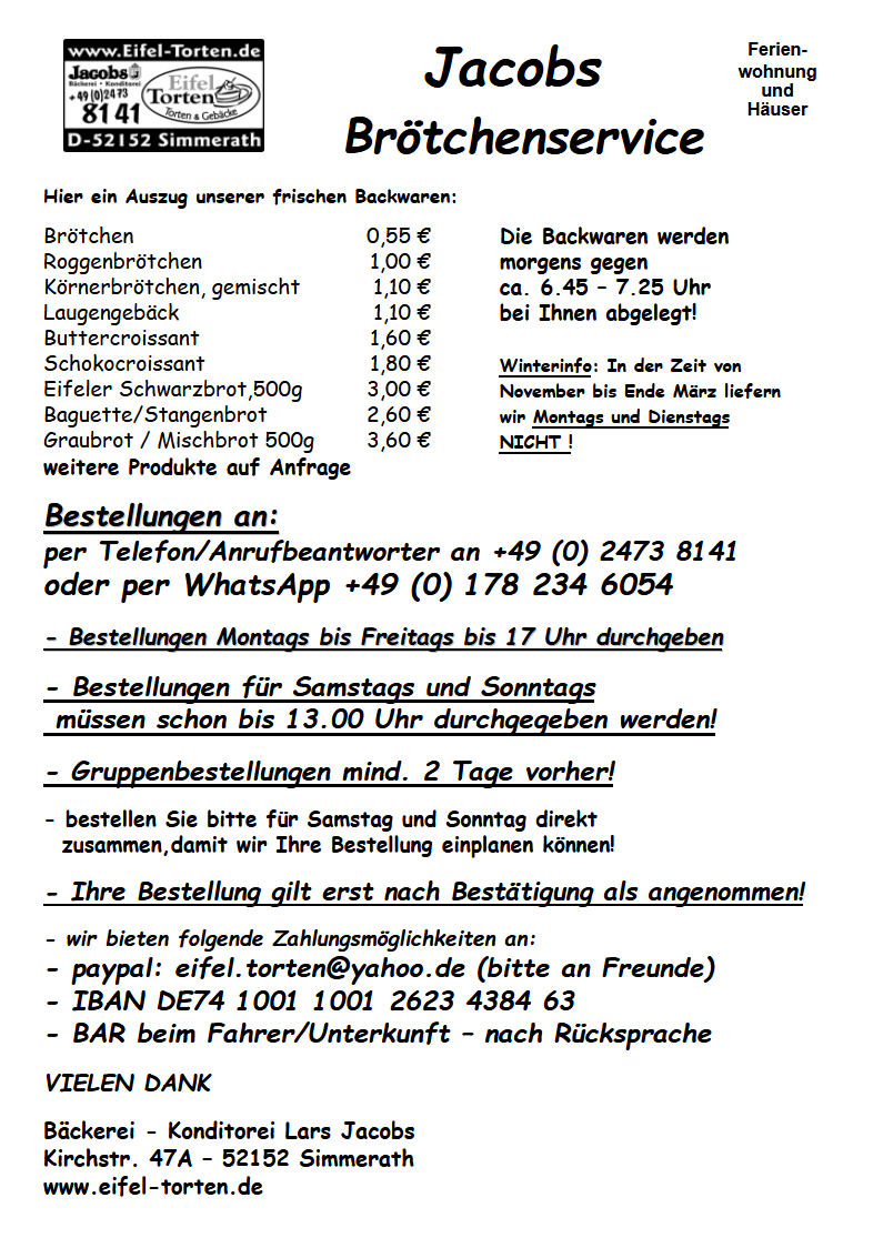 Sie haben die Möglichkeit sich in Ihrem Urlaub oder Eifel-Aufenthalt morgens verwöhnen zu lassen. Wir fahren täglich von Ostern bis Anfang November ( im Winter Montags und Dienstags keine Lieferung ) nach Einruhr, und Umgebung und versorgen Sie mit frischen Backwaren und mehr. Einfach per Anruf oder WhatsApp bestellen und per Paypal, IBAN oder Bar zahlen. Alles weitere entnehmen Sie bitte den Infos. Rückfragen gerne an die +491782346054 oder per Email an info@eifel-torten.de Wichtig: diese Email- Adresse ist KEIN Bestellformular! Samstag und Sonntags haben wir bereits AM VORTAG um 13 Uhr Bestellschluss, damit wir Ihre Bestellung noch einplanen können. Vielen DANK 🙂